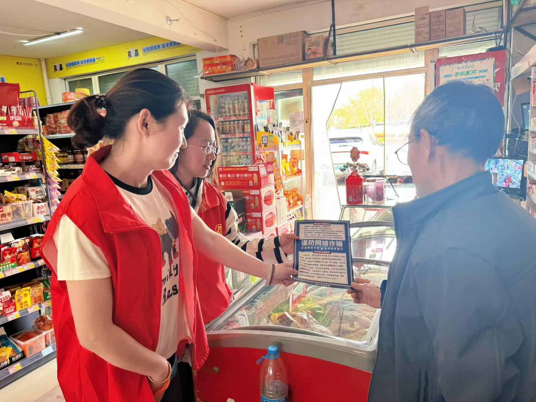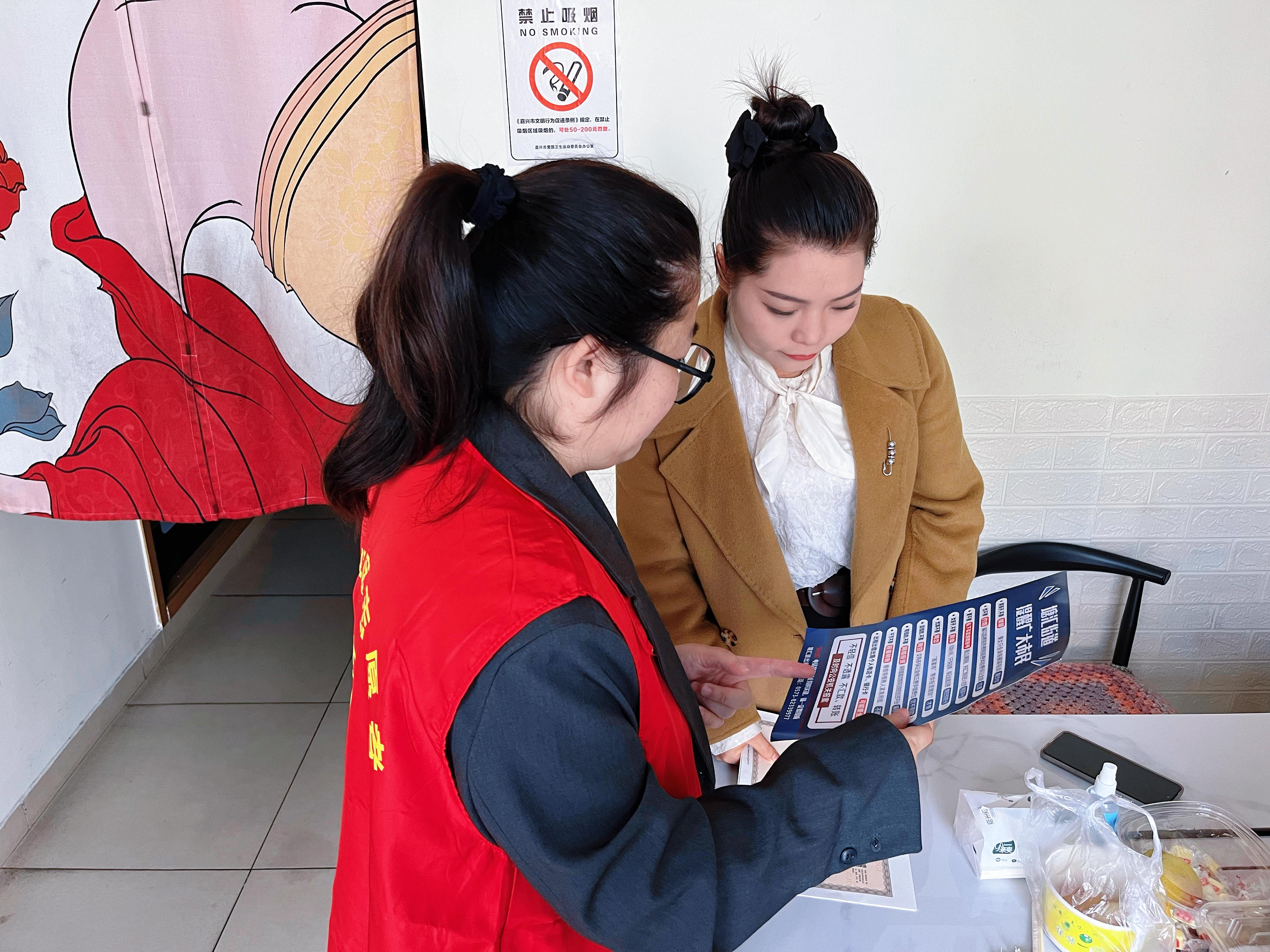 广场宣传结束后,巾帼志愿者们分组深入辖区沿街商铺,开展“点对点”精准反诈宣传。针对商铺经营者资金往来频繁、易遭遇冒充公检法转账、虚假订单退款等骗局的特点,提醒商户在日常经营中要妥善保管个人信息和账户信息,谨慎核实陌生订单、陌生转账要求,遇到可疑情况及时拨打反诈专线求助,切勿轻易向陌生账户汇款。志愿者们还同步开展垃圾分类、食药安全、反家暴、统计普法等多主题宣传,将安全守护、文明风尚与法治理念一并送到商户身边,切实提升辖区群众的安全意识、法治意识与文明素养。