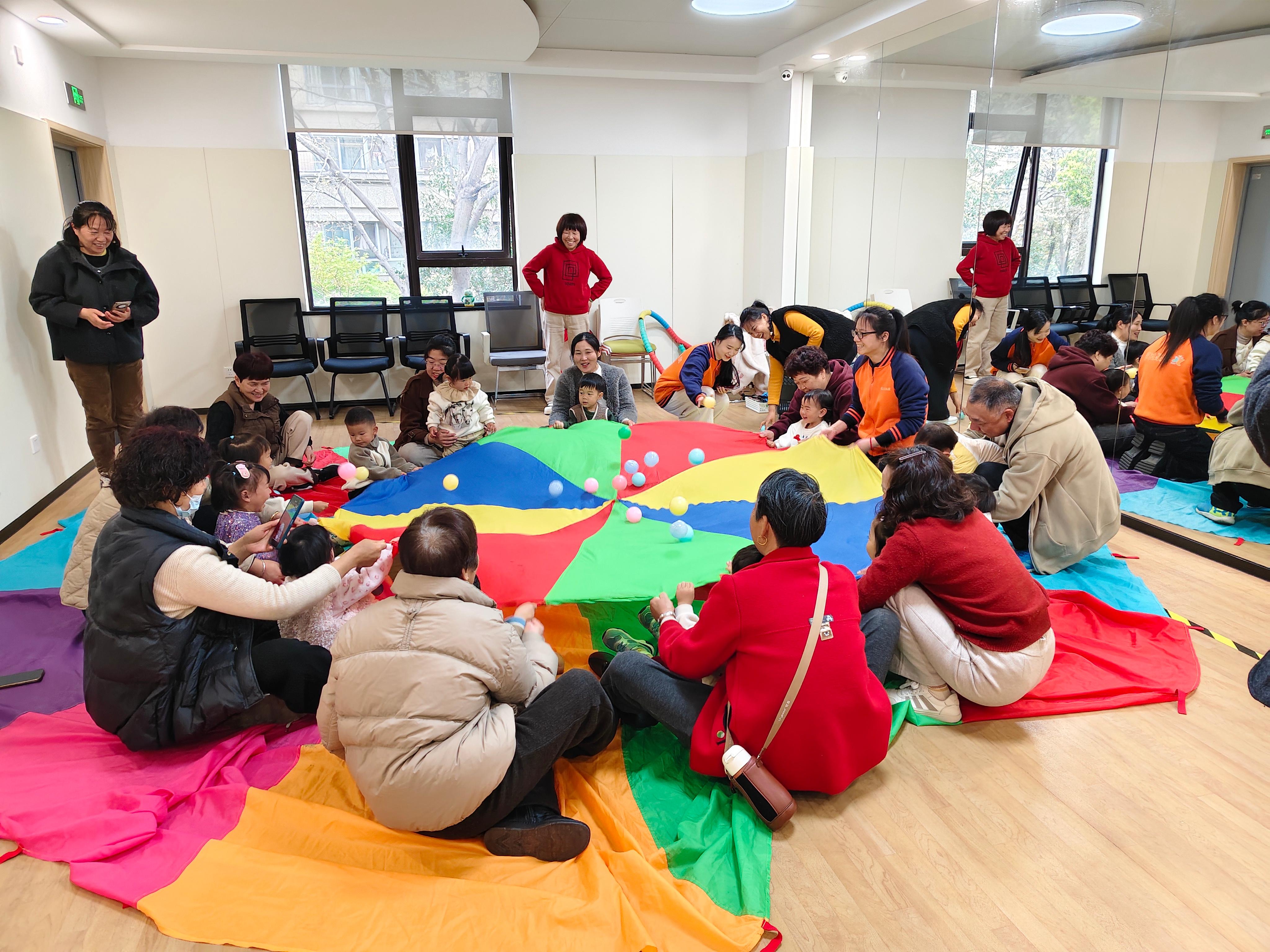活动在轻快的《春天在哪里》音乐声中拉开帷幕。孩子们在家长的陪伴下慢慢融入集体氛围。在“春雨沙沙”感官游戏环节,老师播放雨声、雷声、鸟鸣等自然音效,引导宝宝们用耳朵“听春天”。随后,家长们共同抖动彩虹伞,模拟海面与大风,孩子们在伞下穿行、嬉戏,海洋球如雨滴般在伞面跳跃,既锻炼了视觉追踪能力,也让孩子们在集体互动中缓解触觉敏感,感受协作的乐趣。