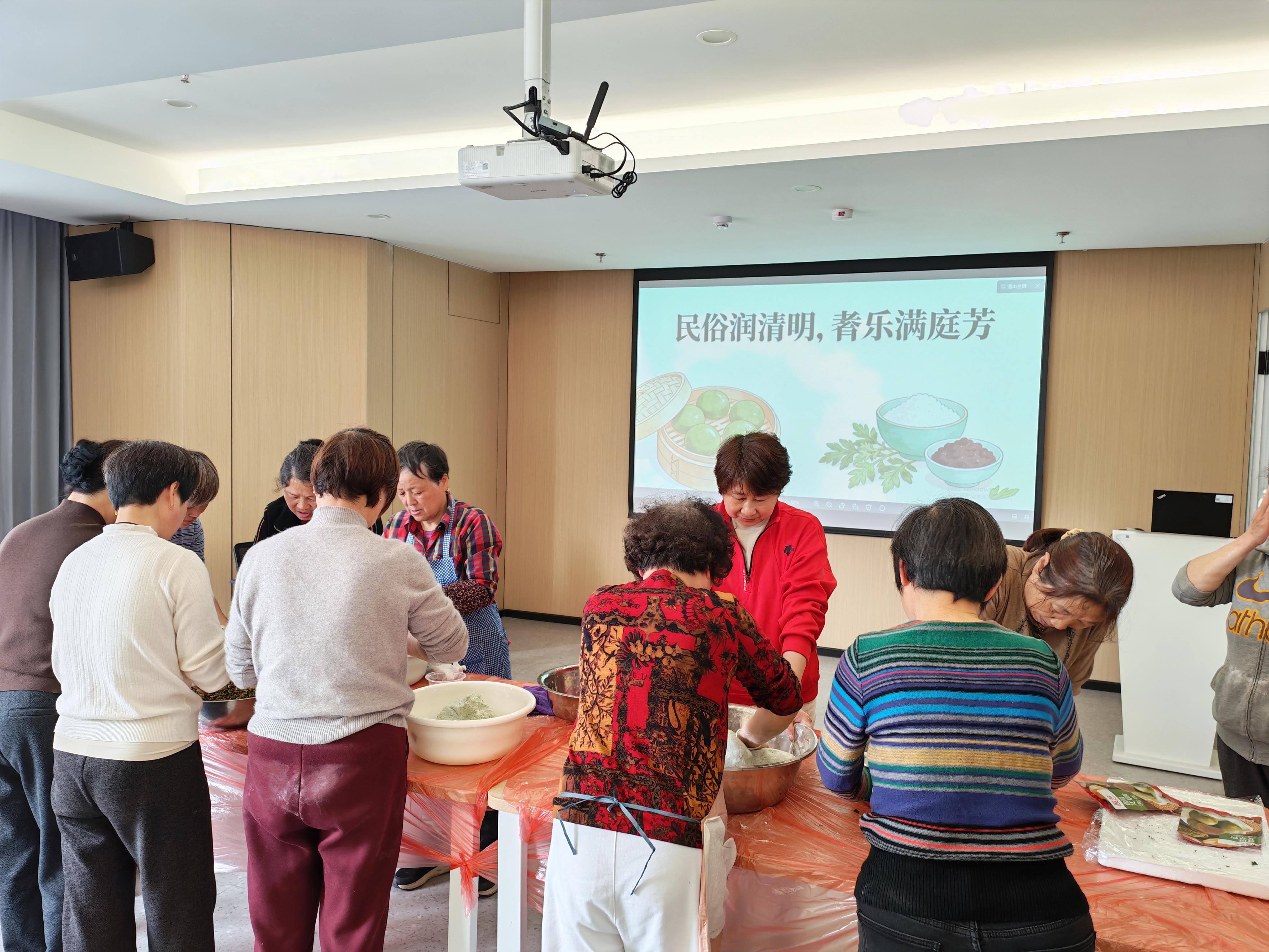 活动现场暖意融融。长者们围坐一堂,在工作人员指导下揉面、捏窝、填馅、收口,一个个翠绿圆润的青团在巧手中成型。手法娴熟的阿姨分享儿时做青团的往事,初次尝试的长者在伙伴帮助下不断进步。大家互帮互助,艾香、米香与笑语交织,邻里情与节日氛围浓郁。