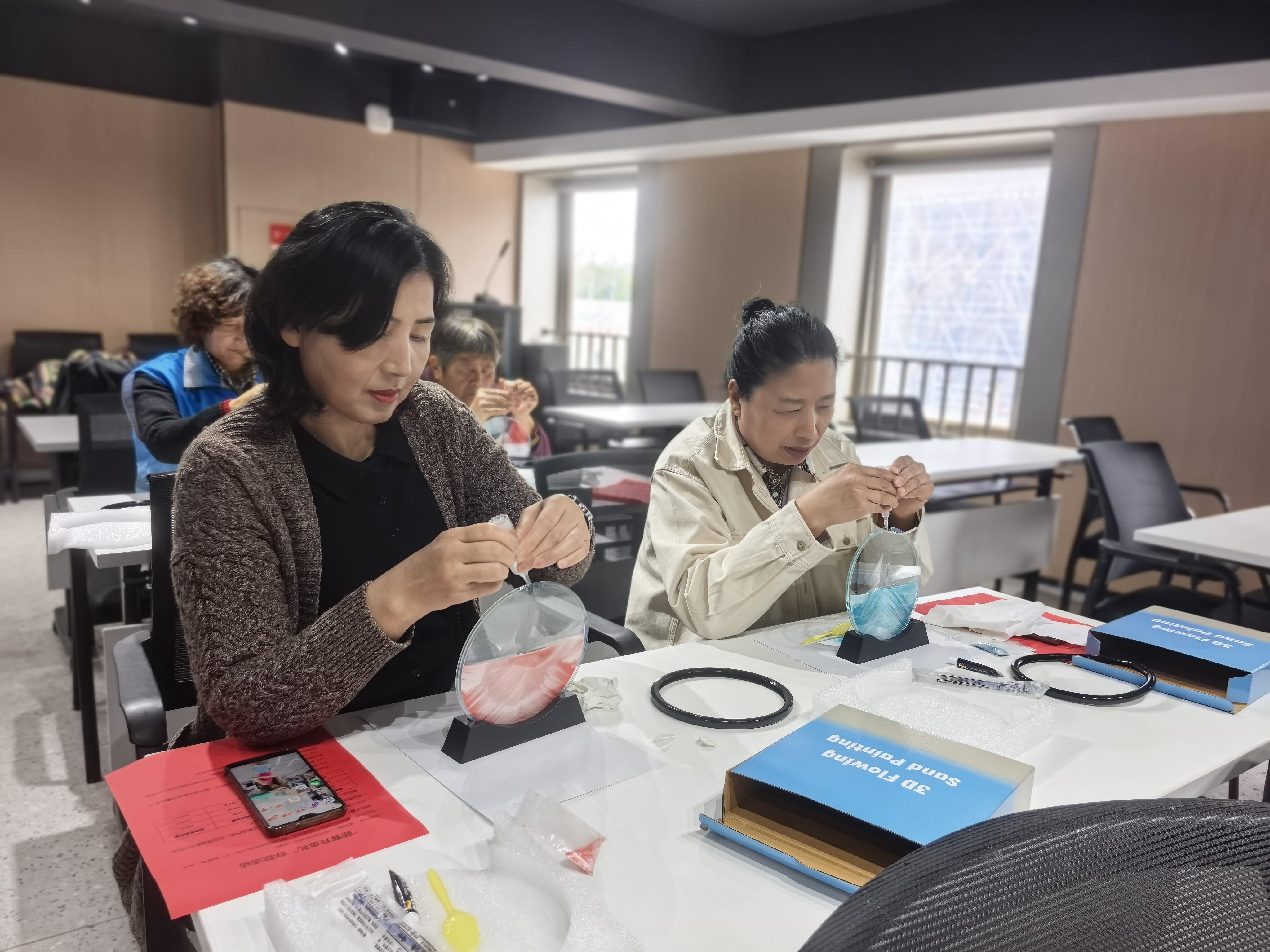 制作过程中,长者们相互交流心得、分享技巧,工作人员与志愿者在旁贴心协助,现场欢声笑语不断、暖意融融。完成作品后,大家纷纷翻转摆台,看着细沙缓缓流动、变幻出不同景致,脸上洋溢着满足与自豪。“没想到一把年纪还能做出这么好看的工艺品,既锻炼了手眼协调,又认识了好多老伙伴,这样的活动太有意义了!”焦阿姨捧着自己的作品开心地说道。