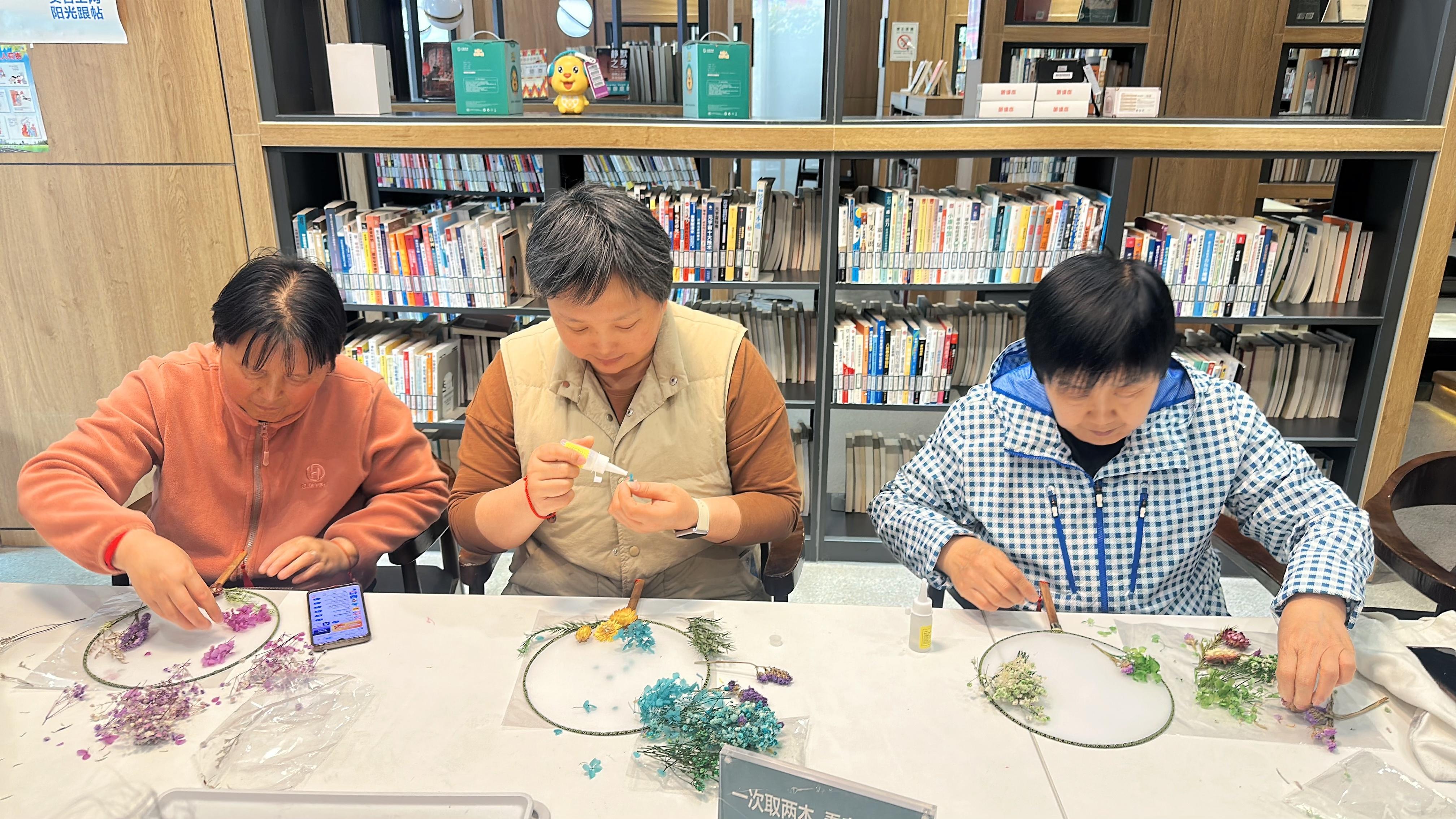 居民们热情高涨,充分发挥想象力和创造力,有的选择淡雅的白玫瑰搭配绿叶,有的用艳丽的康乃馨点缀扇面,还有的搭配小巧的满天星增添层次感。大家相互交流技巧、分享创意,现场氛围温馨融洽,欢声笑语不断。经过一个多小时的精心制作,一把把精致美观、独具特色的永生花团扇相继完成,每一把都承载着大家对生活的热爱与美好期许。