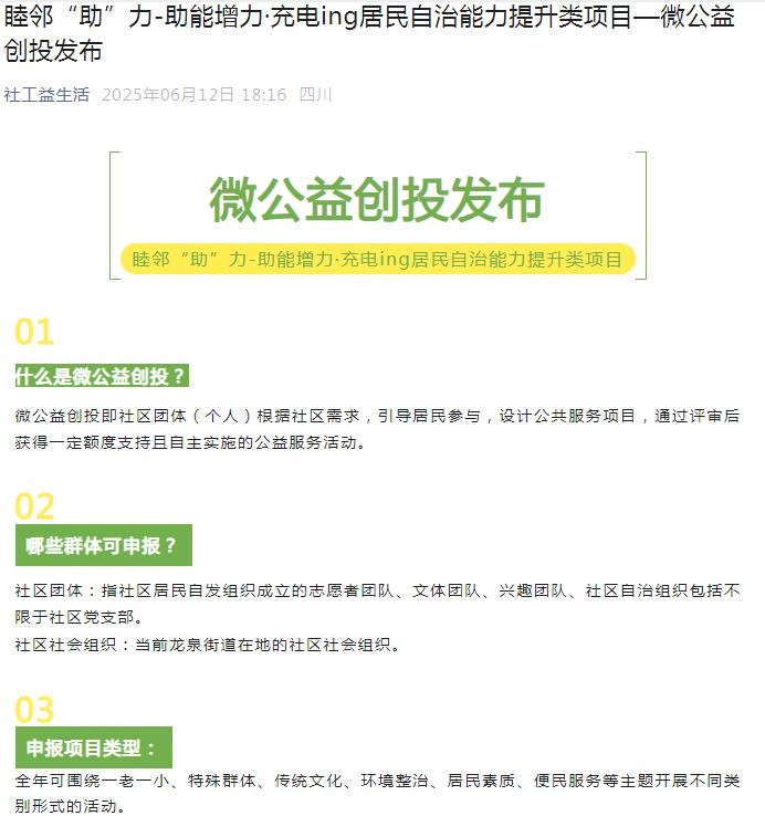 成都市龙泉驿区龙泉街道公园路社区在2025年城乡社区发展治理保障资金使用中,创新实践“赋能驱动+微创投落地”双轨模式,成功实施“睦邻‘助’力-助能增力·充电ing”居民自治能力提升项目。