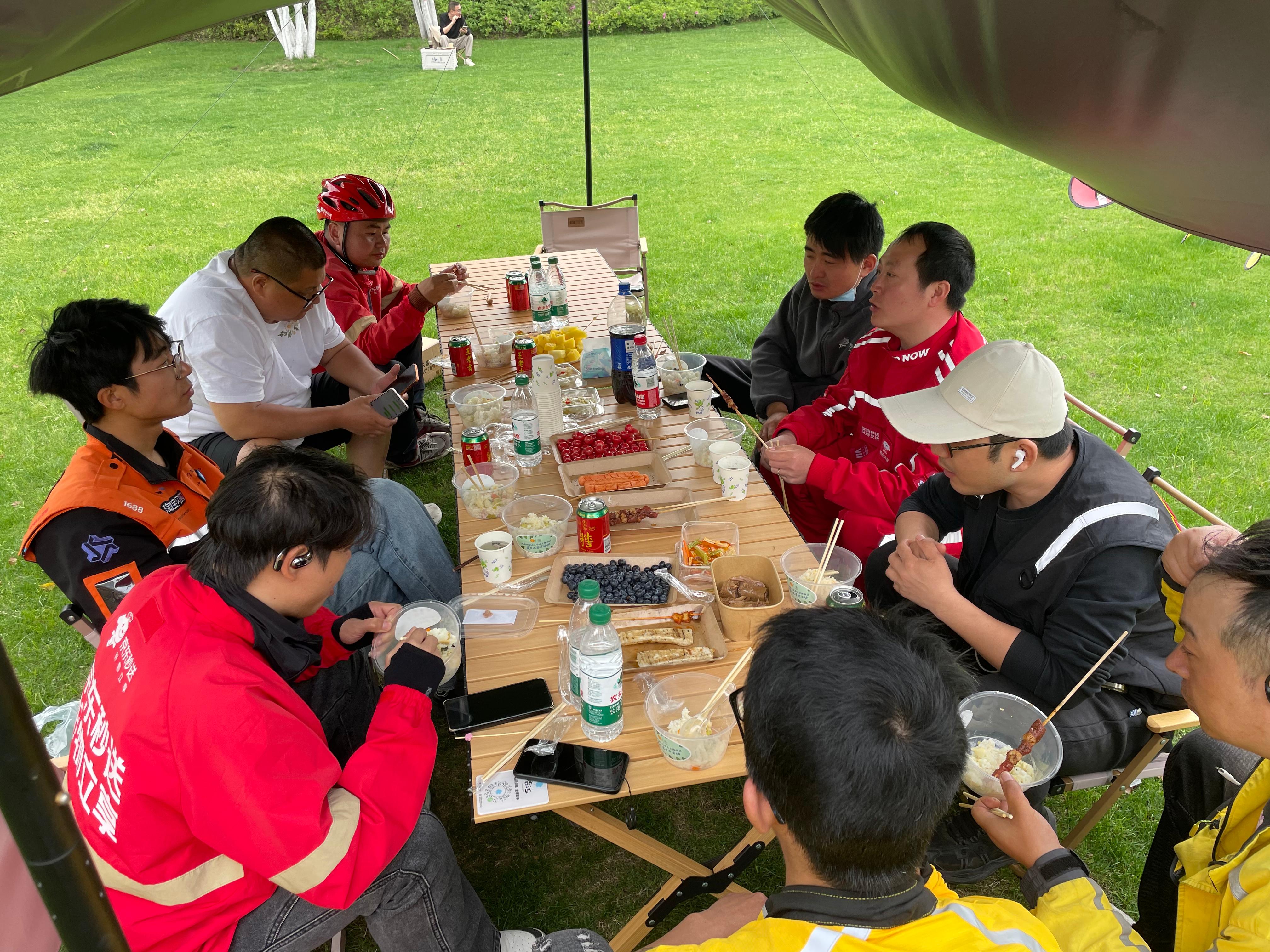 紧接着,烧烤派对热闹开启。牛肉串、五花肉、蔬菜串在烤架上滋滋作响,香气四溢。大家围坐在一起,品尝着烤好的串烧,欢声笑语在运河边回荡。在享受美食的同时,活动还穿插了趣味套圈和“骑手知多少”知识问答环节。问答内容围绕交通安全、社区治理、本地文化等展开,骑手们边吃边玩、踊跃抢答,现场笑声不断,答对者还收获了精美小礼品。随后的拔河比赛更是将气氛推向高潮。大家齐心协力、奋力拼搏,充分展现了团队协作精神。